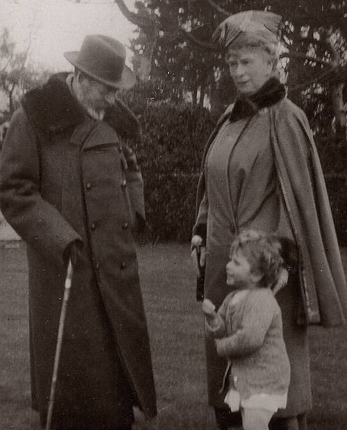 Маленькая Лилибет, будущая королева Елизавета II, улыбается своему дедушке, королю Георгу V, на прогулке с бабушкой, королевой Марией Текской в 1929 году.