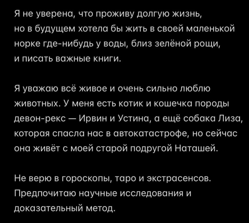 Она создала чат в телеге в свое время, там проявила себя как особо болезная. От сери там отличий вообще ноль, безумство и "отвага". Пафоса до неба, сочиняет на ходу такую хуйню, что страшно становится. Как раз из разряда виллы в петере и прочих бесконечных возможностей. Очень любит всем угрожать.